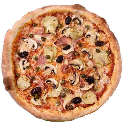 Pomodoro, mozzarella, prosciutto cotto, funghi, carciofi, olive, origano